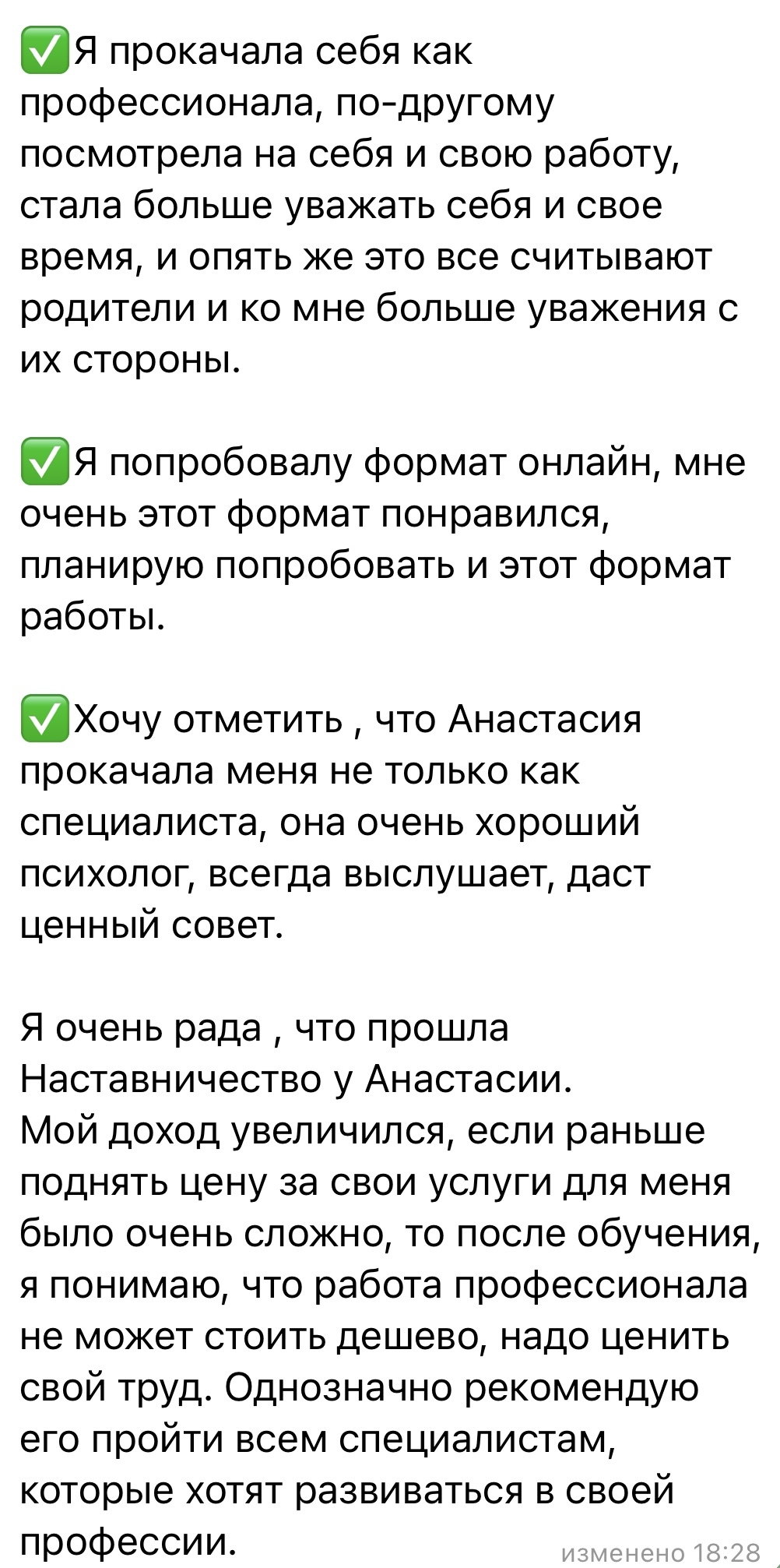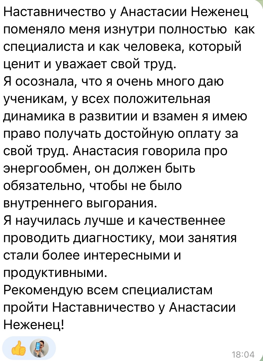 ✅Хочу отметить , что Анастасия прокачала меня не только как специалиста, она очень хороший психолог, всегда выслушает, даст ценный совет.