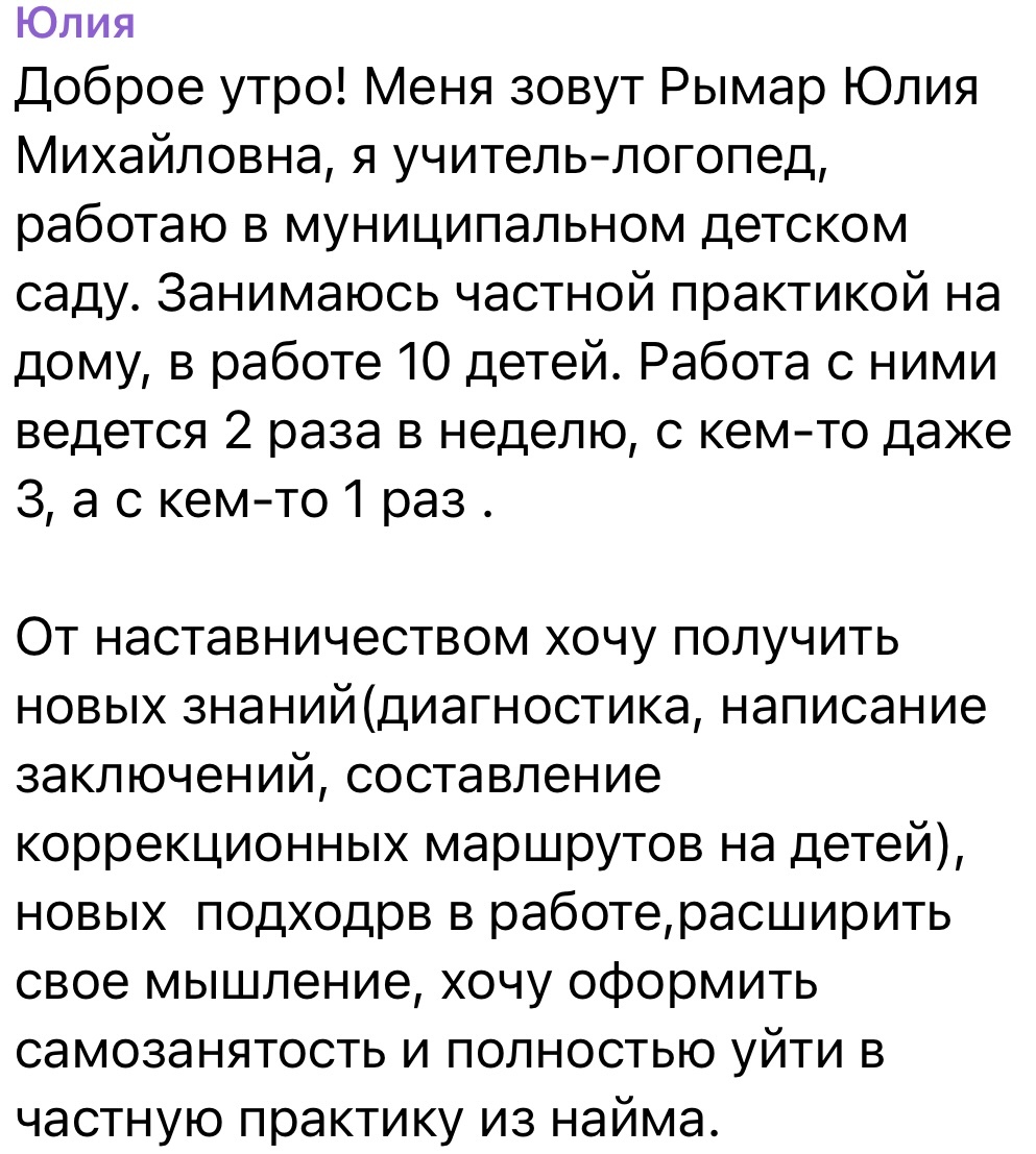 От наставничеством хочу получить новых знаний(диагностика, написание заключений, составление коррекционных маршрутов на детей), новых подходов в работе, расширить свое мышление, хочу оформить самозанятость и полностью уйти в частную практику из найма.