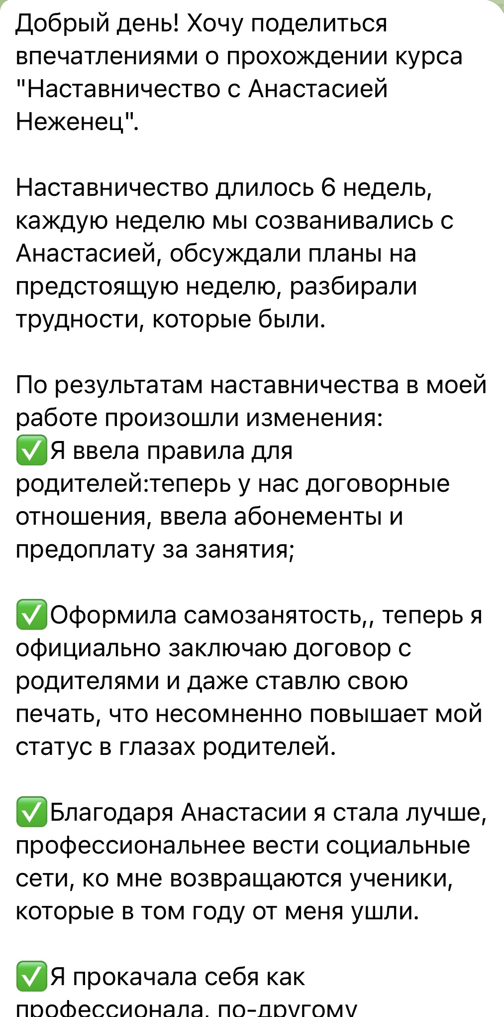 Добрый день! Хочу поделиться впечатлениями о прохождении курса "Наставничество с Анастасией Неженец".
